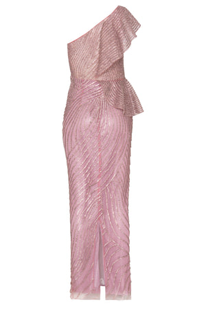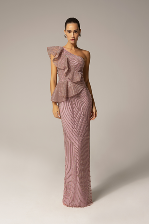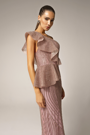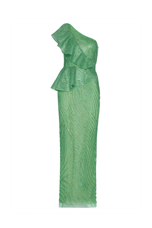 Íncrível vestido longo, bordado a mão com strass de cristal, decote um ombro só, com acabamento peplum, que modela o corpo de forma elegante e sutil. Fechamento por zíper invisível. Uma escolha sofisticada e luxuosa para se destacar em um evento especial.