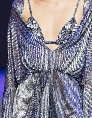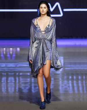 Vestido curto, decote V, mangas longas amplas, com recorte na cintura e saia assimétrica. Detalhe anterior com prega levemente mais curto.