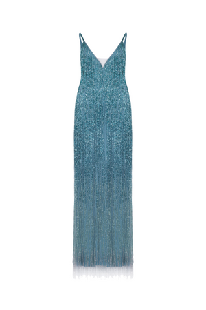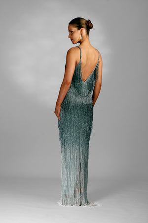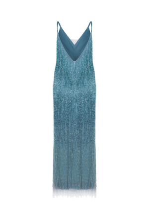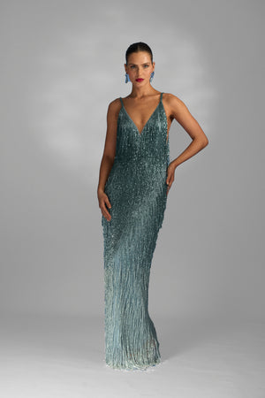 Vestido longo com alças finas e decote em V, todo o vestido é adornado com franjas bordada a mão que criam um efeito de brilhante.