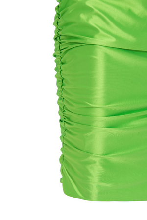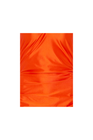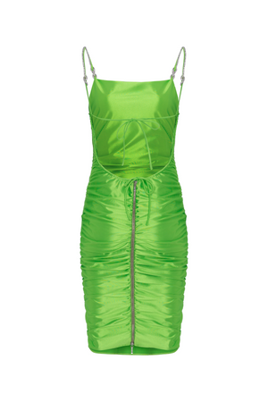 Vestido midi cetim stretch franzido nas laterais e costas, com decote profundo nas costas e zíper posterior na saia e alças com rolotês de cristais.
