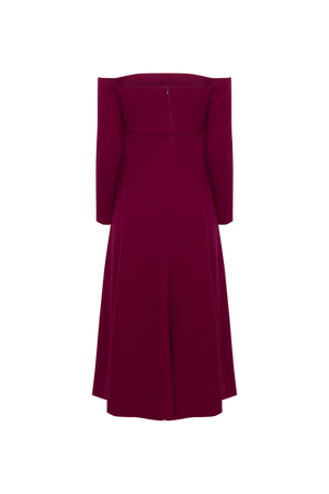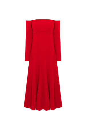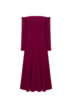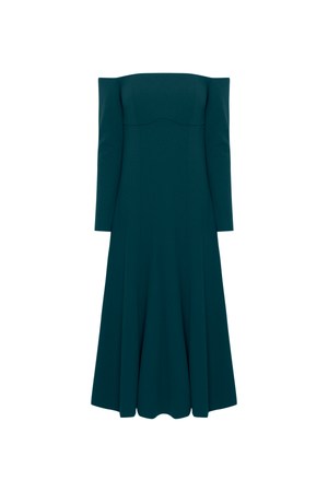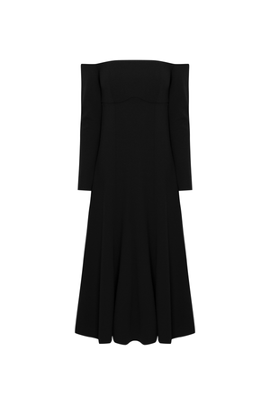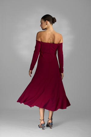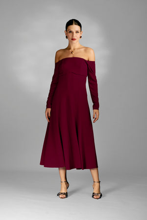 Vestido mídi ombro a ombro com nesgas estrategicamente posicionadas, conferem volume e movimento à saia. As mangas longas equilibram a sensualidade dos ombros à mostra, tornando-o uma escolha versátil para diversas ocasiões,