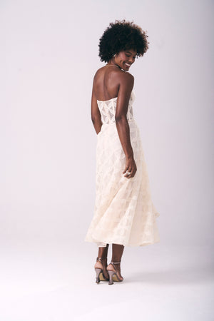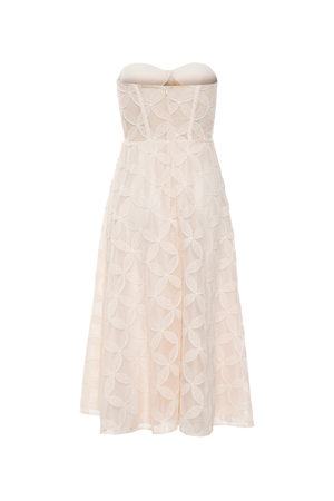 Vestido midi com parte superior estruturada tipo corselet. Confeccionado em tela com desenho floral geométrico, possui bojo liso, recortes verticais e modelagem evasê a partir da cintura. Fechamento posterior por zíper invisível.