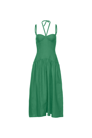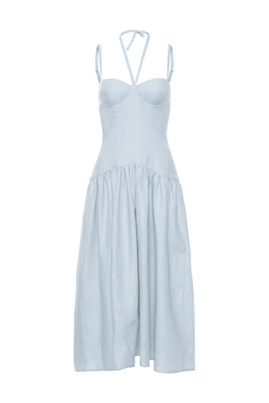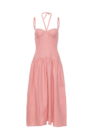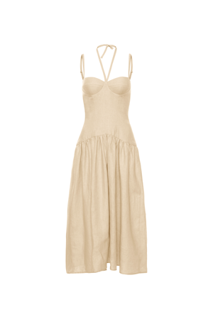 Este vestido mídi em linho apresenta uma parte superior estruturada em formato de corselet com bojo marcado, realçando a elegância da peça. As alças duplas com amarração no pescoço conferem um detalhe delicado, enquanto o cós baixo e o recorte na cintura com saia franzida valorizam a silhueta. O fechamento posterior por zíper invisível garante um acabamento refinado, perfeito para ocasiões que exigem sofisticação e estilo.