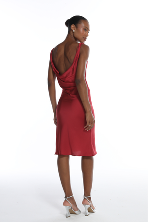 Vestido mídi em cetim lanvin, com brilho sutil e caimento perfeito ao corpo. O modelo apresenta frente única, que cria movimento suave e valoriza o colo com delicadeza. A modelagem ajustada acompanha as curvas naturalmente, enquanto a saia levemente evasê traz fluidez ao caminhar.