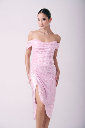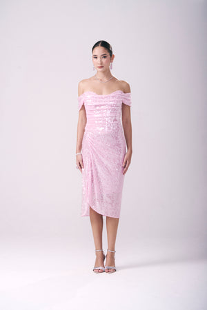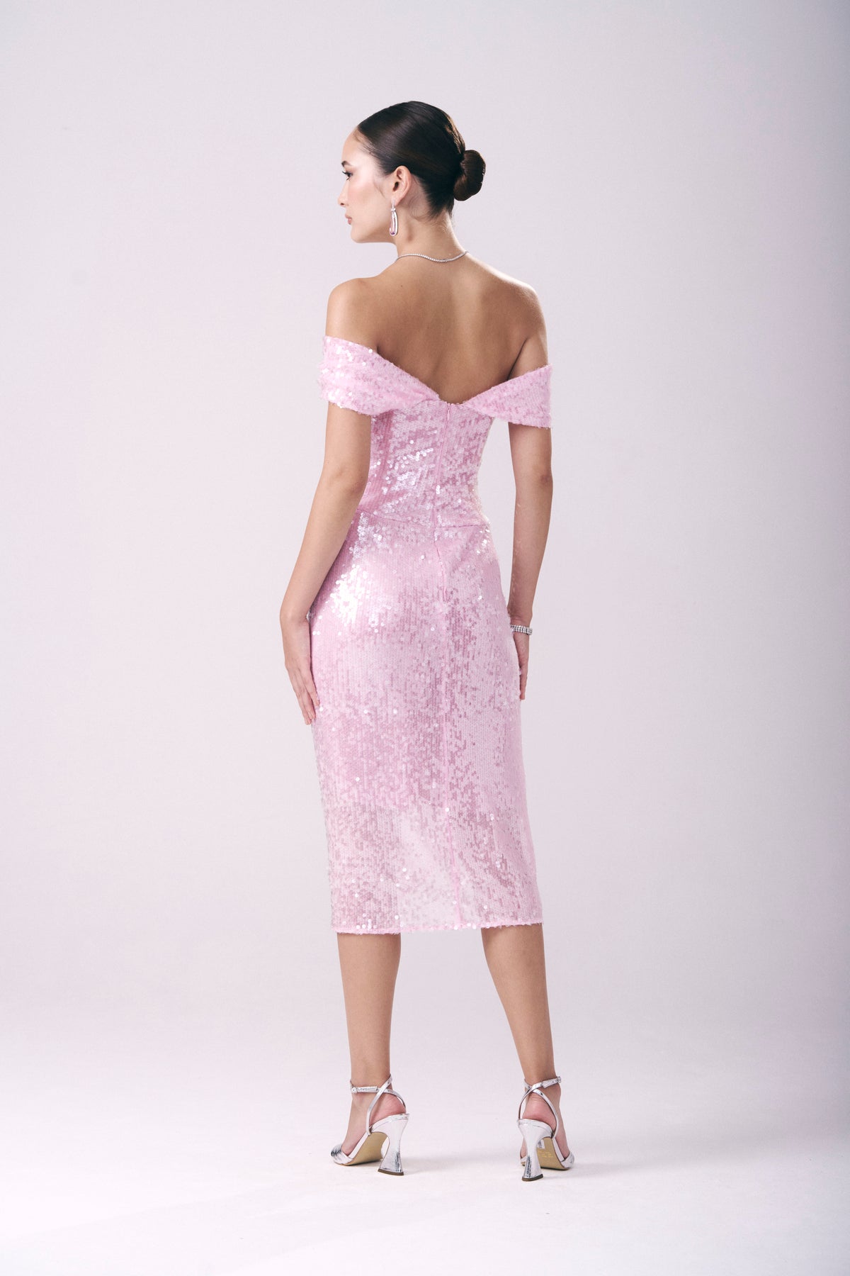 Vestido midi em paetê translúcido que une sofisticação e feminilidade. A modelagem ajustada ao corpo valoriza a silhueta, enquanto o decote ombro a ombro cria uma linha elegante nos ombros. A saia drapeada com franzido lateral oferece movimento. O fechamento por zíper invisível nas costas garante um acabamento impecável e discreto. Uma escolha refinada para ocasiões que pedem presença marcante e estilo elevado.