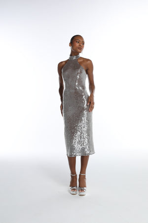 Vestido midi em paetê que combina elegância contemporânea com conforto. A gola alta estruturada valoriza os ombros e cria um efeito alongador na silhueta, enquanto o corte justo ao corpo realça suas curvas naturalmente. Ideal para eventos especiais, festas e ocasiões que exigem sofisticação.
