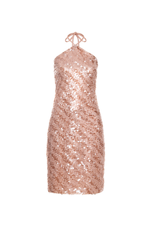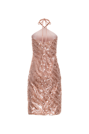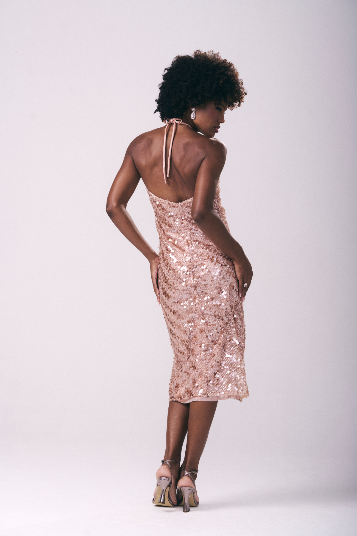 Vestido midi em paetê cobre que combina elegância e sensualidade. O decote halter com alças finas realça os ombros, enquanto a modelagem ajustada ao corpo destaca suas curvas naturalmente. Comprimento midi que cai abaixo dos joelhos oferece sofisticação discreta, perfeito para eventos noturnos e ocasiões especiais. O zíper invisível nas costas garante um acabamento impecável e uma silhueta limpa. Uma peça versátil que transita entre o glamour e a discrição.