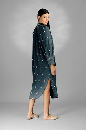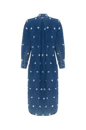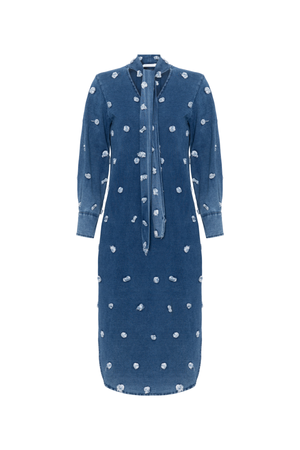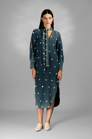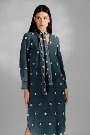 Vestido Midi Poá com Decote em "V" arredondado com amarração na gola em tiras compridas, mangas longas e com punho.