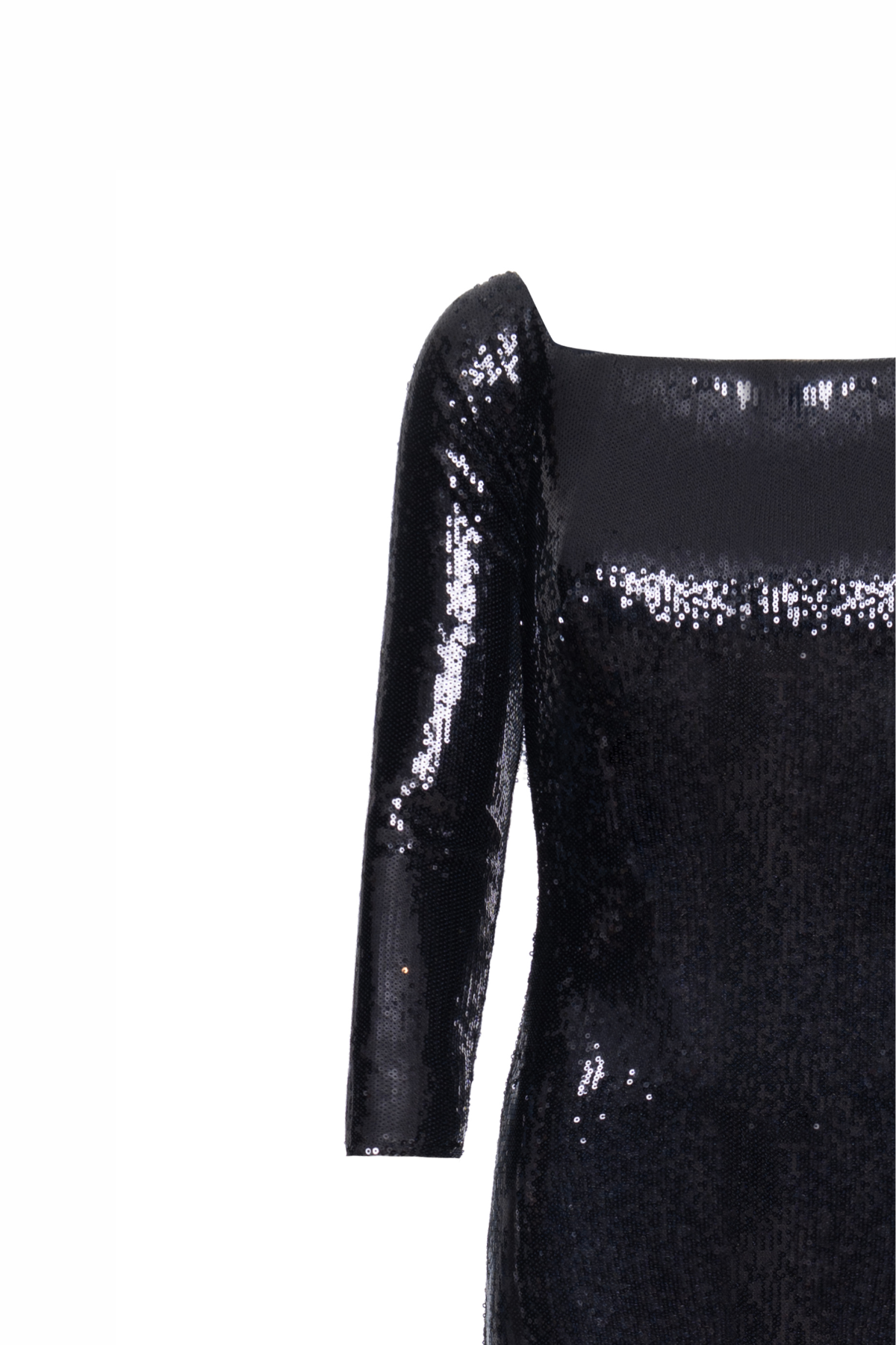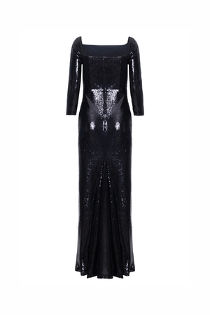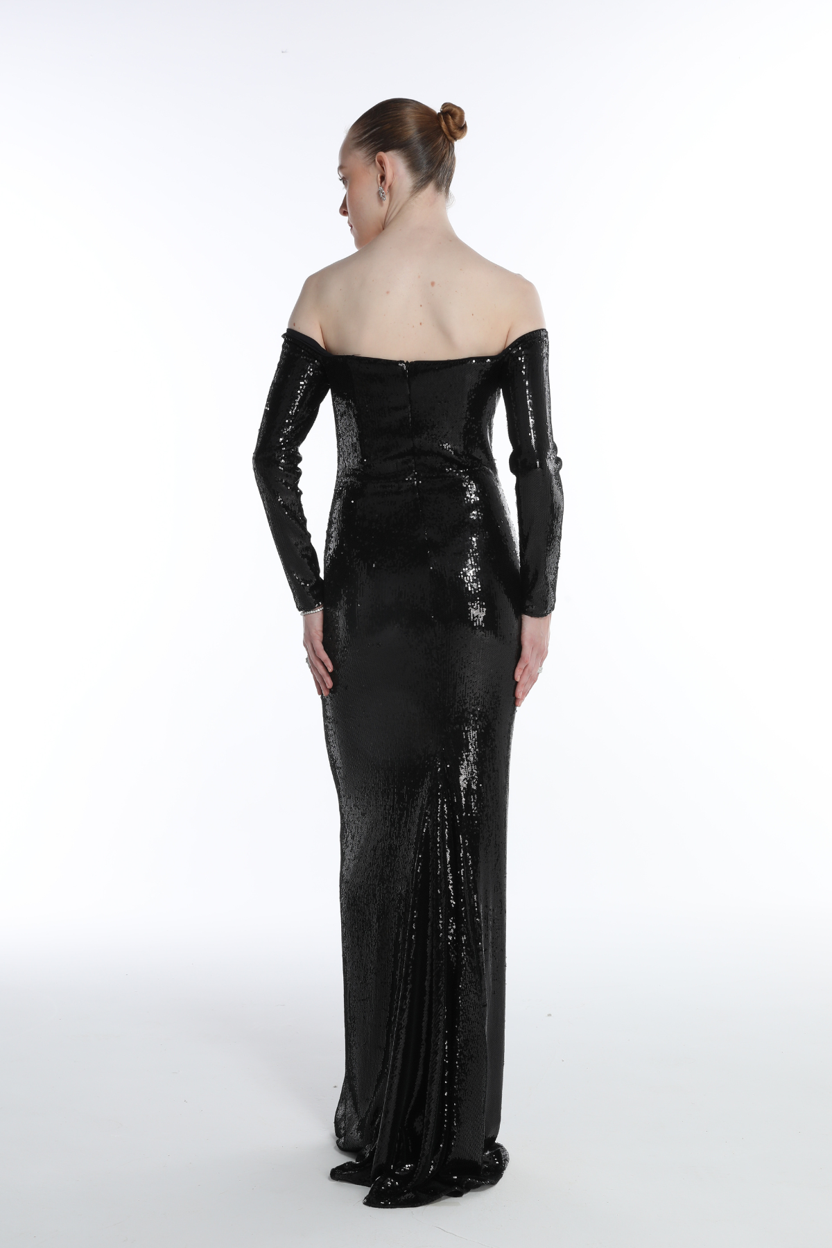 Vestido longo em micropaetê que traduz sofisticação em cada detalhe. O corte ombro a ombro com mangas longas oferece uma silhueta elegante, enquanto o micropaetê proporciona um brilho sutil e refinado. O ajuste ao corpo valoriza suas formas naturalmente, criando uma presença marcante. Perfeito para ocasiões especiais que demandam estilo impecável e distinção.