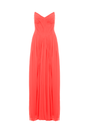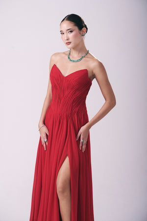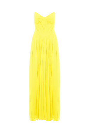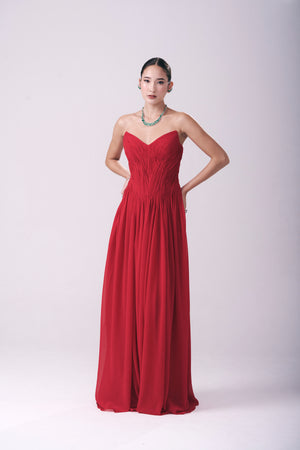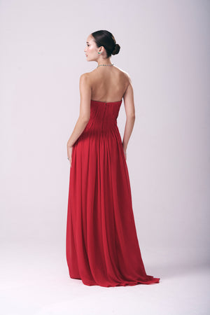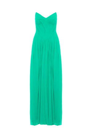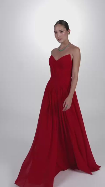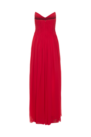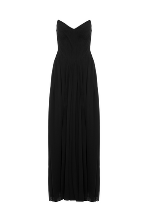 Este vestido longo em chiffon Saab destaca-se pelo design sofisticado e atemporal. Sem alças, apresenta um decote com pontas que alonga a silhueta, enquanto o corpo estruturado com drapeados feitos à mão valoriza a elegância. A saia fluida confere movimento e leveza, ideal para ocasiões especiais. O fechamento por zíper invisível nas costas garante um acabamento impecável e discreto. Uma peça chic que une conforto e estilo refinado.