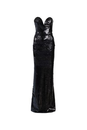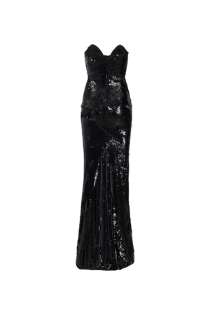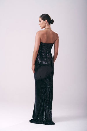 Este vestido longo em paetê vinil destaca-se pelo design sofisticado e elegante. Sem alças, apresenta um decote coração estruturado que valoriza a silhueta. Ajustado ao corpo até o quadril, seu caimento proporciona conforto e movimento. O fechamento por zíper invisível nas costas garante um acabamento impecável, ideal para ocasiões especiais que pedem um toque de glamour.