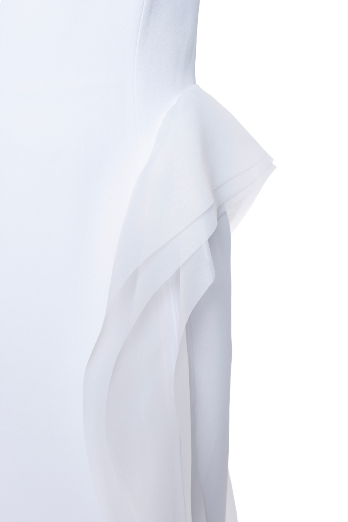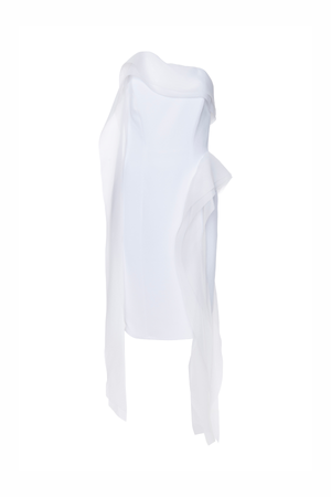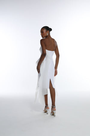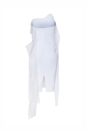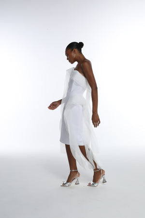 Vestido mídi sem alças em crepe que realça a silhueta com sofisticação. As generosas camadas de organza fluida criam movimento envolvente, conferindo leveza e dinamismo à peça. Ideal para ocasiões especiais que exigem elegância refinada e presença marcante.