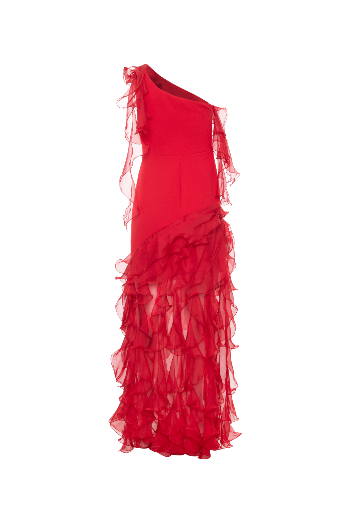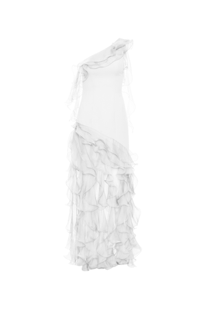 Este vestido longo de um ombro único combina a elegância do crepe com a leveza da saia de babados em jabo de musseline, proporcionando um caimento fluido e sofisticado. O fechamento por zíper invisível na lateral garante um ajuste perfeito e discreto, ideal para ocasiões que exigem charme e estilo refinado.