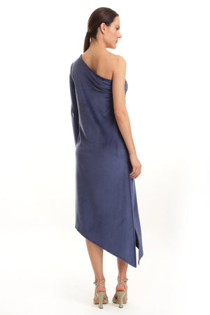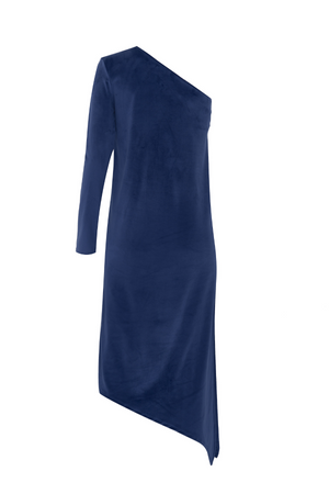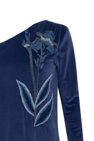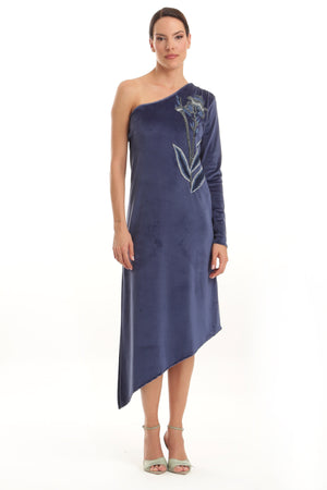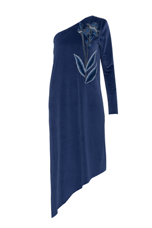 Vestido mídi de veludo, borrdado a mão, confortável e modelagem assimétrica na barra. Com design moderno e uma manga só, este vestido é a escolha perfeita para eventos formais ou ocasiões especiais. Sinta-se elegante e confortável ao mesmo tempo.